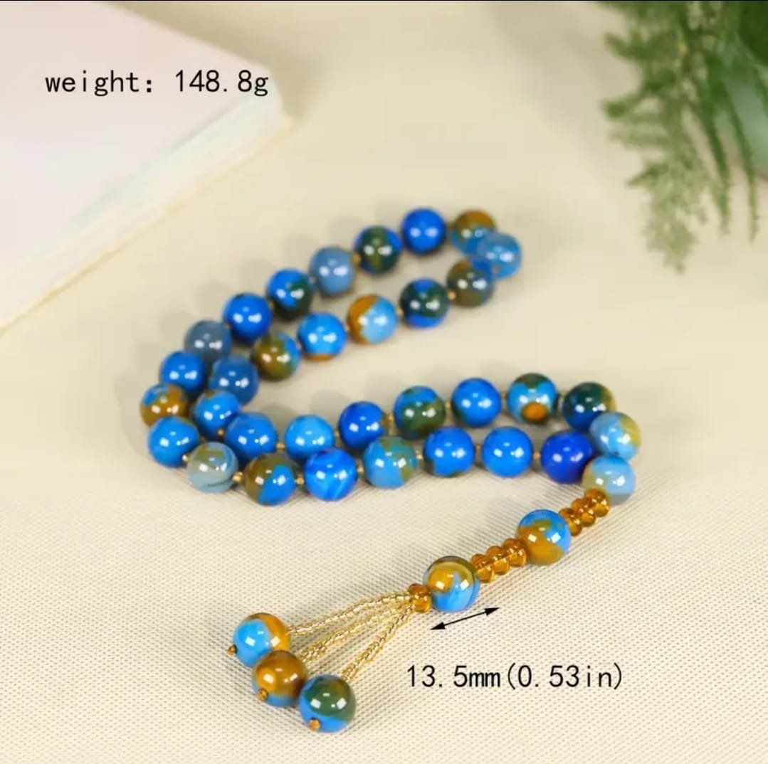 العقيق الأزرق: حجر العقيق الأزرق بلونه الساحر يذكرك بصفاء السماء واتساعها، حجر يُعرف بقدرته على تهدئة الأعصاب وتعزيز الثقة بالنفس. الأقحوان السماوي: حجر الأقحوان السماوي بألوانه المتدرجة بين الأزرق والبني والأصفر، يضفي على السبحة لمسة من الغموض والجمال، وكأنه يحمل بين طياته أسرار الكون. تصميم فريد: كل حبة من حبات السبحة فريدة من نوعها، بألوانها وتشكيلاتها الطبيعية، مما يجعل السبحة قطعة فنية لا مثيل لها. 33 حبة من التأمل: عدد حبات السبحة (33 حبة) يساعدك على التركيز والتأمل، ويجعل من التسبيح تجربة روحانية عميقة.